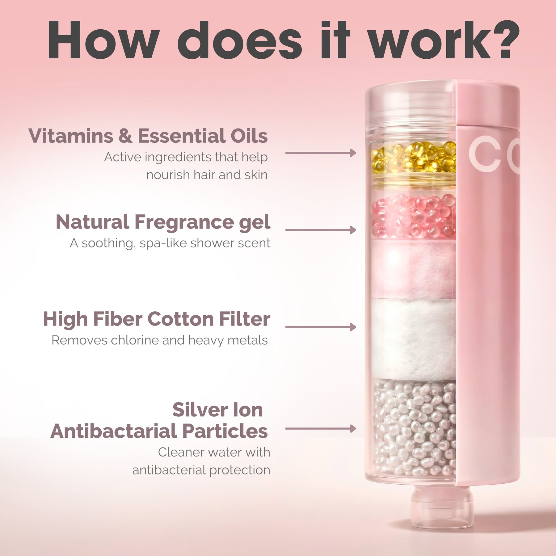 Filters out harsh minerals that strip moisture, while glycerin and coconut oil infuse into water to deeply hydrate—so your lotions finally work and skin stays soft all day.